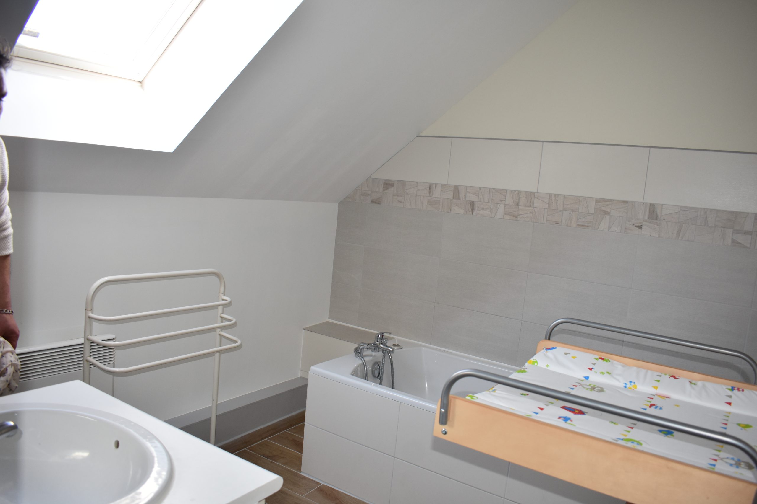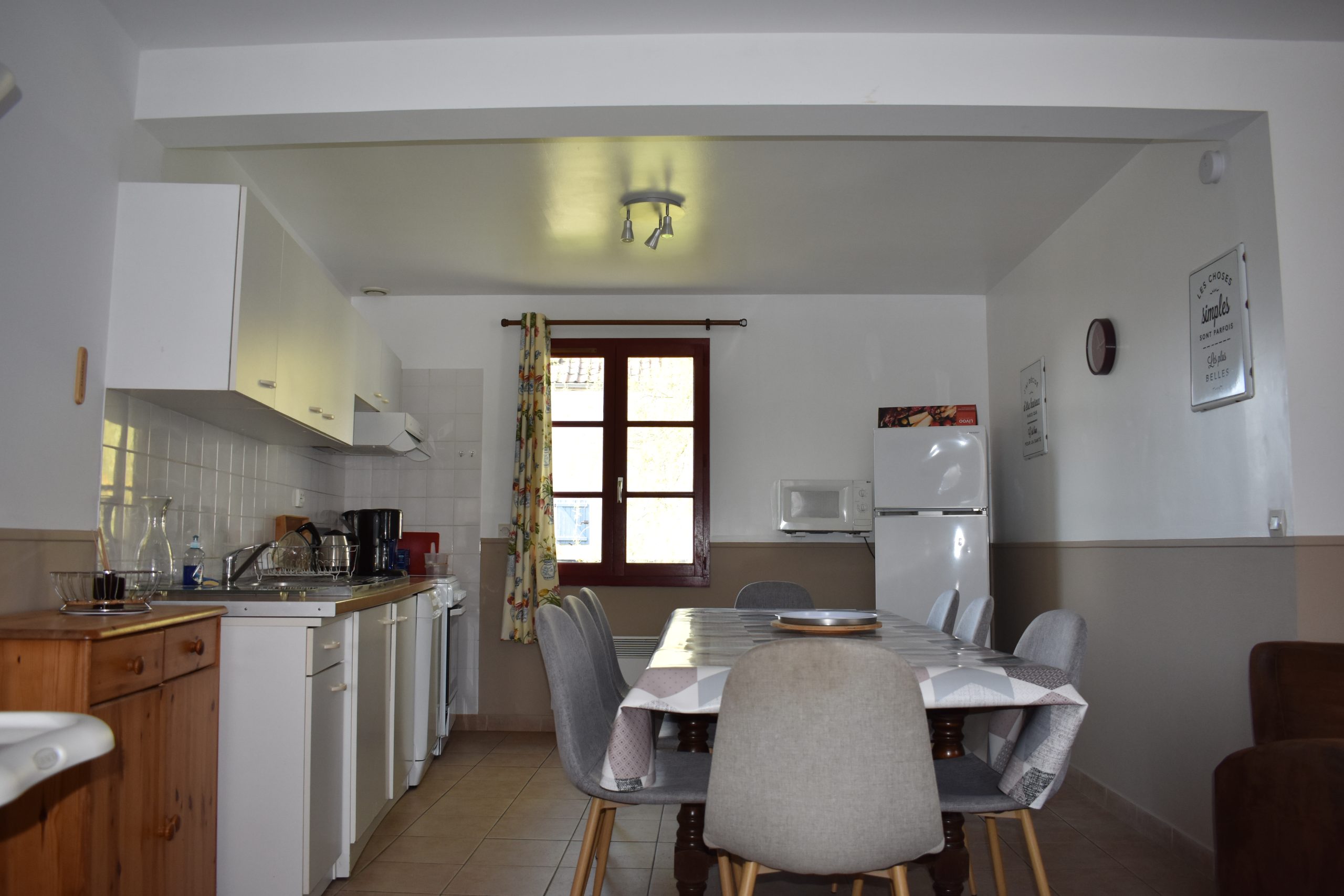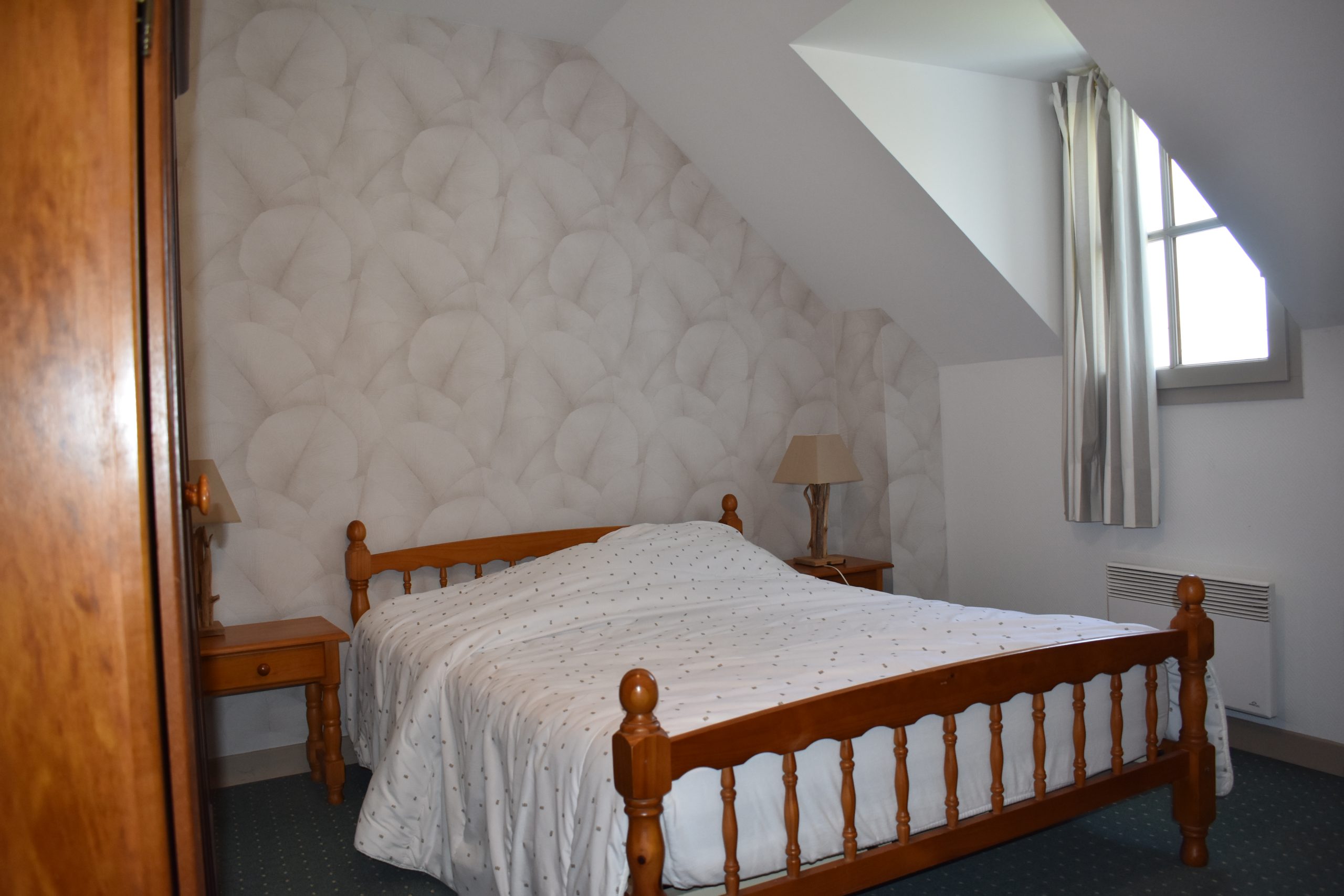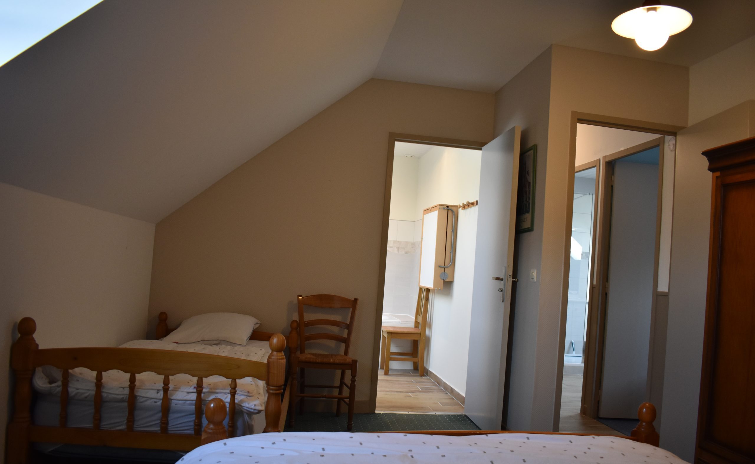 Le Gîte Les Poiriers vous accueille dans un intérieur chaleureux et fonctionnel, parfaitement adapté aux séjours en groupe. Au rez-de-chaussée, vous profitez d’un grand séjour lumineux avec coin salon et cuisine ouverte entièrement équipée (four, micro-ondes, lave-vaisselle, etc.). Une première chambre avec lit double 160×200 (séparable) ainsi qu’un WC indépendant complètent cet étage.